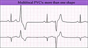 2. Multifokal PVC (Çok odaklı erken vuru): uyarılar farklı odaktan çıkar. QRS kompleksleri farklı görünümde ve eşlenme aralıkları eşit değildir.