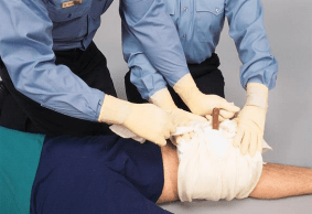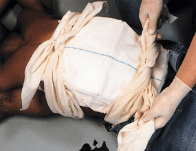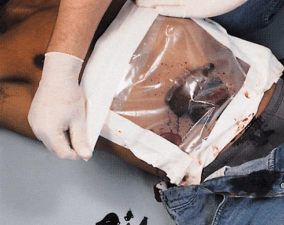 - Yara üzerine plastik poşet, naylon vb. sarılmış bir bezle 3 tarafı kapatılır.